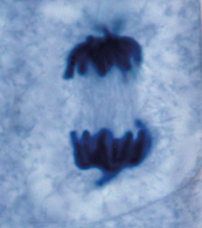 - A lo largo de la tercera fase, la anafase, los cromosomas se rompen por el centrómero, las cromátidas hermanas se separan, y los filamentos del huso acromático se acortan y arrastran cada cromátida a un polo de la célula.