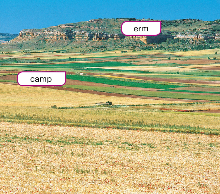 • Erms, que són zones planes i elevades, de sòls pobres i amb vegetació escassa. Se situen a les vores de la Meseta.