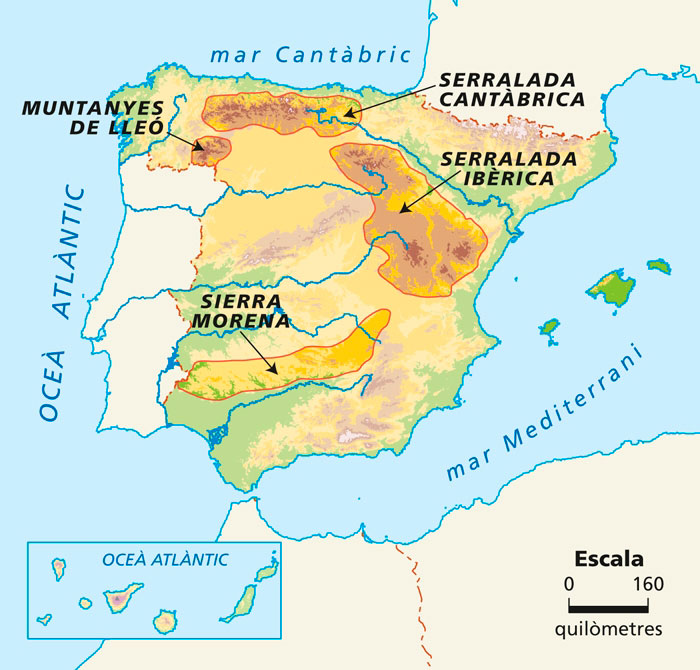 • La serralada Ibèrica es troba a l’est. S’estén per les comunitats de Castella i Lleó, la Rioja, Aragó, Castella-la Manxa i la Comunitat Valenciana. Presenta elevacions d’uns 2.000 metres, entre les quals destaquen la serra del Moncayo i la serra de La Demanda.