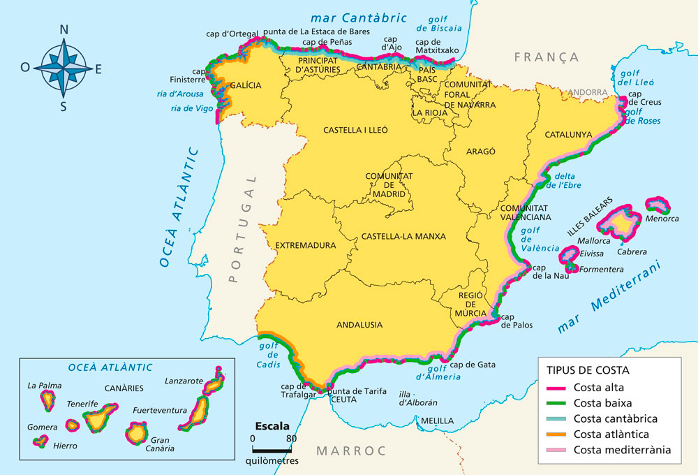 A més, a la costa es poden trobar ries, que són desembocadures de rius per on entra aigua del mar; maresmes, que són zones costaneres planes que s’inunden; o albuferes, que són llacunes litorals d’aigua salada separades del mar per una franja estreta de terra.
