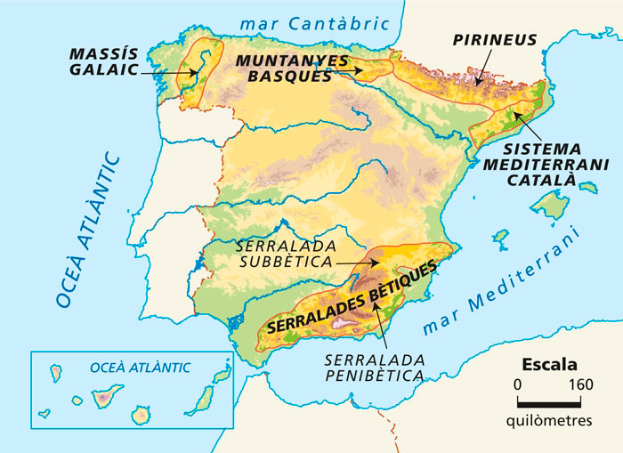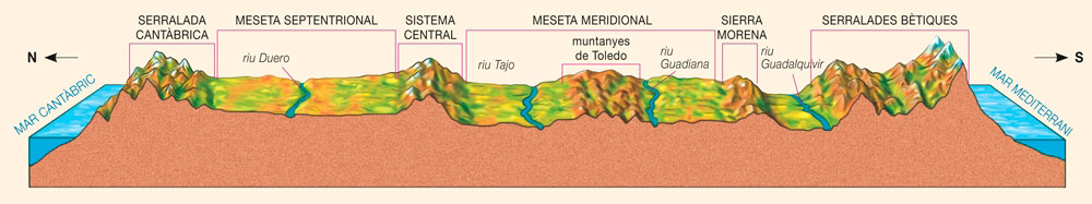 El relleu de la Península s’organitza entorn de la Meseta. Dins s’hi distingeixen dues cadenes muntanyoses i, al voltant, quatre serralades més.