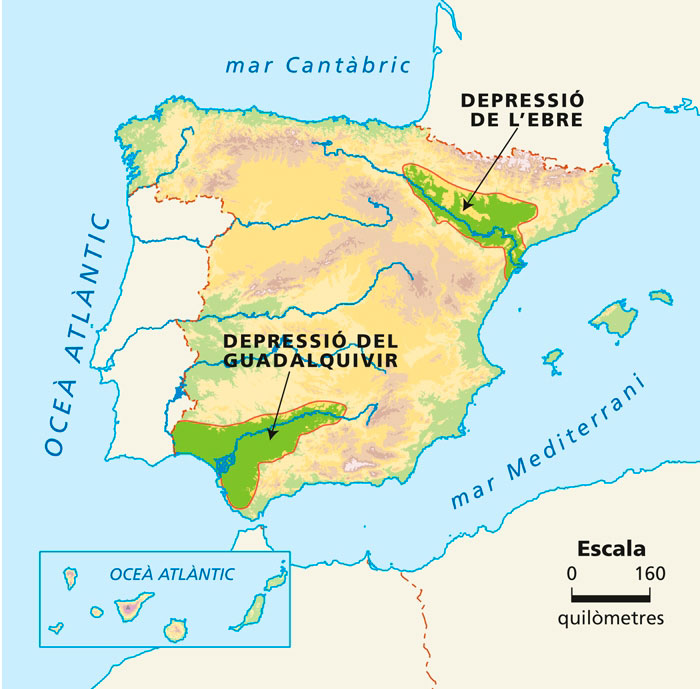 A la Península hi ha dues depressions àmplies exteriors a la Meseta: la depressió de l’Ebre i la depressió del Guadalquivir.