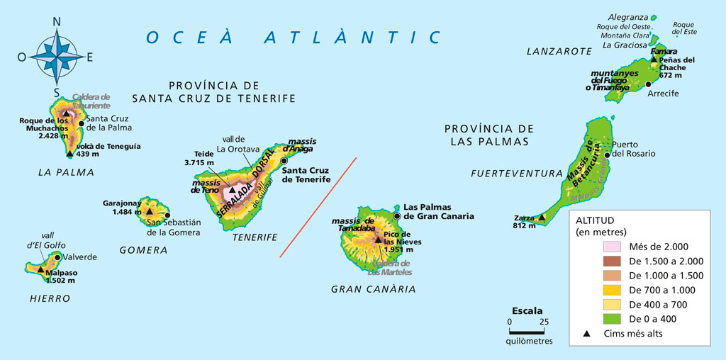 • Gran Canaria té les elevacions més altes al centre de l’illa i l’altitud va descendint cap a la costa.