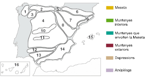El relleu de la Meseta no és uniforme. S’hi distingeixen tres zones: