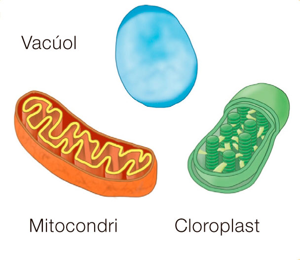 Al citoplasma es troben diferents orgànuls (vacúols, mitocondris, cloroplasts…) i al nucli es troba el material hereditari (ADN).