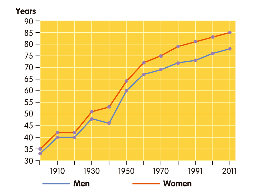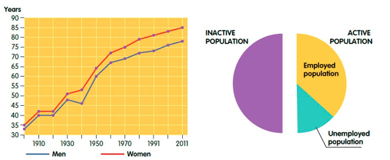 Life expectancy in Spain has increased. This is because of advances in medicine and improvements in living and working conditions.