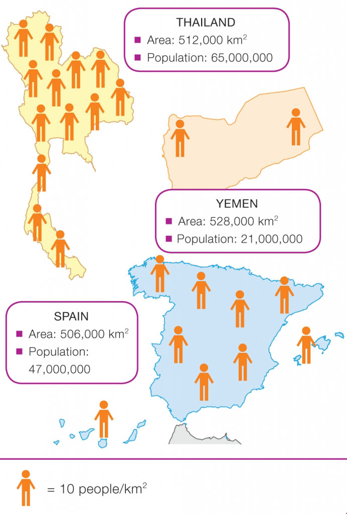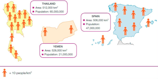 • Why are the orange figures closer together in Thailand than in Spain and Yemen?
