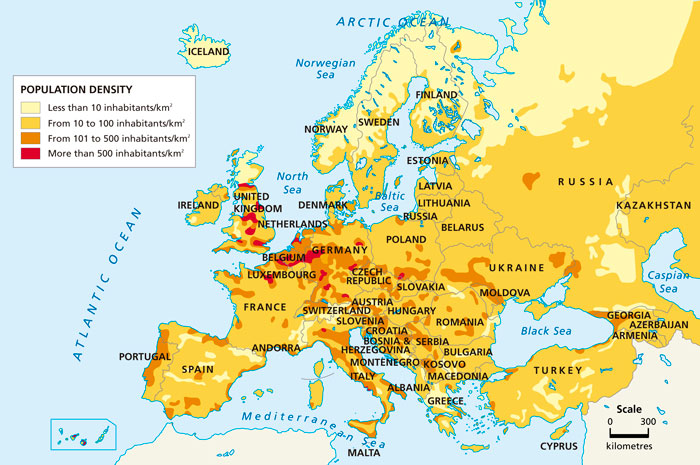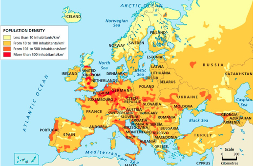 The population of Europe is unevenly distributed. There are areas with very high population density and areas with very low population density.