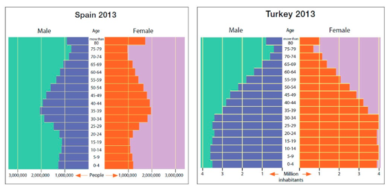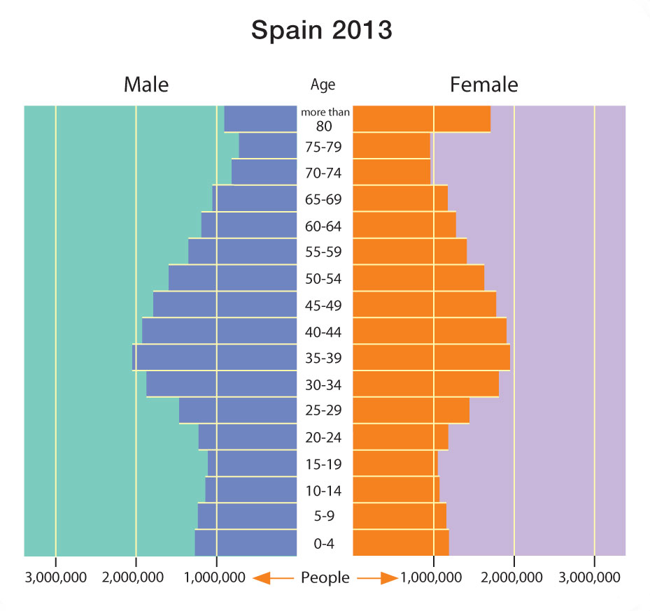 In Spain, there are more elderly people than young people. This is because the birth rate is low and people are living for longer. This is called an ageing population.