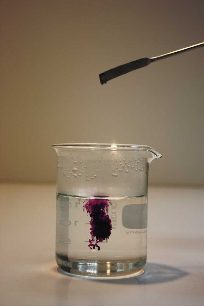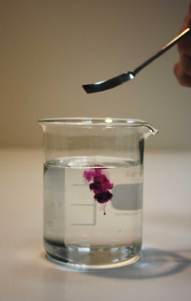 Estás en el laboratorio y quieres comprobar cómo influye la temperatura en la mezcla de ciertas sustancias. En la secuencia superior se ha echado permanganato de potasio en agua fría y en la secuencia inferior en agua caliente. ¿Qué diferencias observas?
