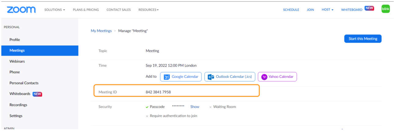 Once created, you will be able to see all the information. Copy the meeting ID and go back to your BlinkLearning profile.