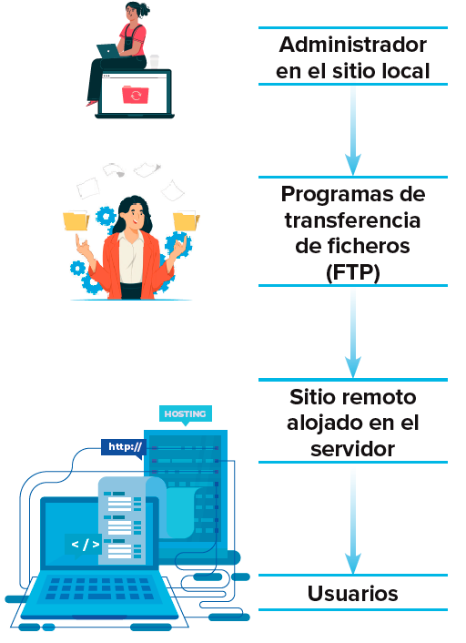 El proceso de trabajo habitual de un administrador es crear en su ordenador el conjunto de archivos que conforman la web (llamado sitio local). El administrador manipula estos archivos y también dispone de un espacio donde guardar la página en un sitio accesible a todos los usuarios de Internet (llamado sitio remoto). Ese sitio está en un ordenador especial que se llama servidor, y el espacio se denomina alojamiento.