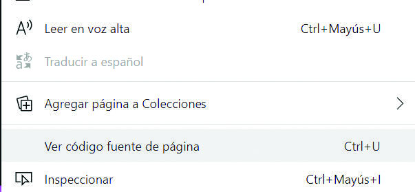 - Sitúa el ratón en cualquier parte de la web (que no sea una imagen o un enlace) y pulsa el botón derecho. Aparecerá un menú emergente con varias opciones. Selecciona Ver código fuente.