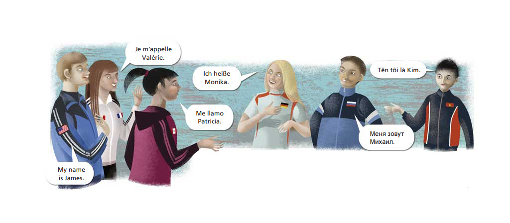 Las diferentes comunidades de hablantes emplean lenguas o idiomas distintos: español, francés, alemán, inglés, catalán, euskera, gallego, etc. Observa cómo se presentan estos seis hablantes originarios de distintos de países.