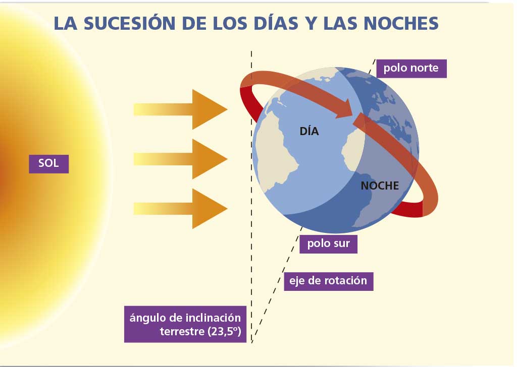 Al observar la imagen, apreciarás que los rayos solares que llegan a la Tierra inciden tan solo sobre una parte de esta, de manera que a lo largo del día, al ir girando la Tierra, van iluminando progresivamente todo el planeta. Esta es la causa de la sucesión de los días y las noches.​