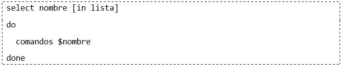 El bucle select nos permite crear menús, con selección por número. La inserción se efectúa mediante el teclado, y si el valor que damos no está en el rango válido, el menú se imprime de nuevo, hasta que insertemos un valor correcto.