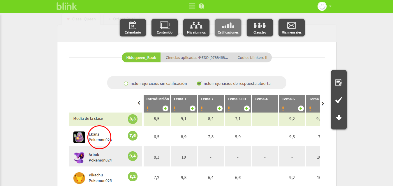 Desde la pestaña CALIFICACIONES puedes acceder a las fichas individuales de todos tus alumnos. Haz click sobre el nombre del alumno que quieras revisar para abrir su ficha.