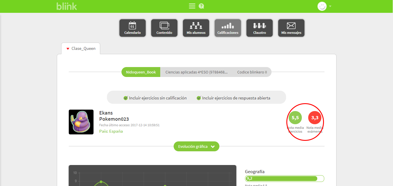 Aquí podrás ver los detalles sobre el progreso académico del alumno, incluyendo medias globales de ejercicios y exámenes.