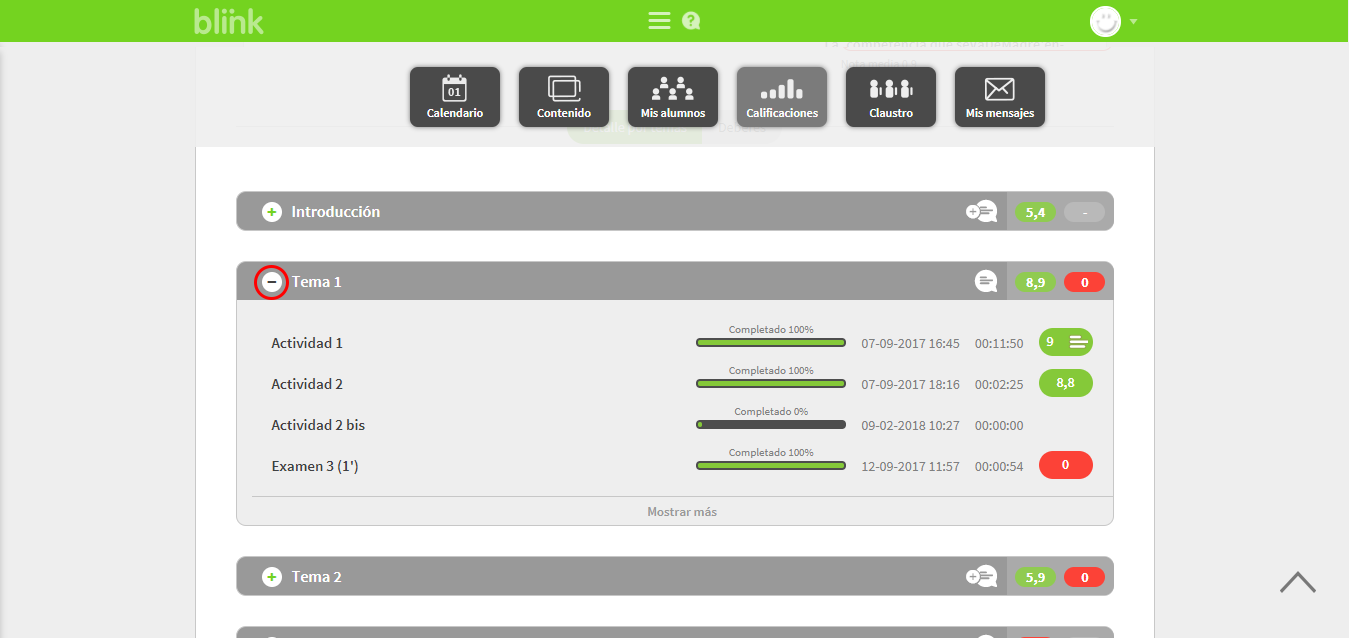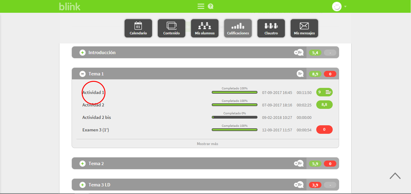 de cualquier tema y se desplegará el contenido de las actividades, así podrás obtener más información sobre actividades completadas por el alumno.
