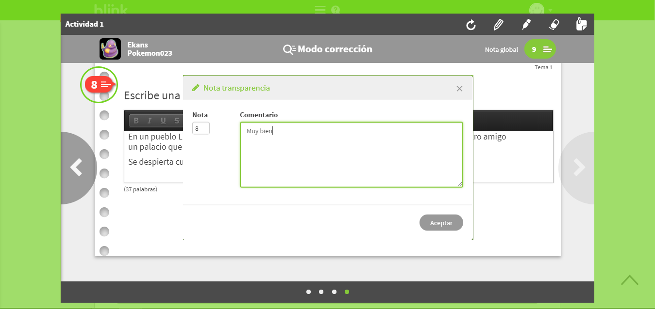 Desde aquí también puedes cambiar las notas de cada ejercicio y las notas globales de la actividad, así como dejar un comentario a tu alumno.