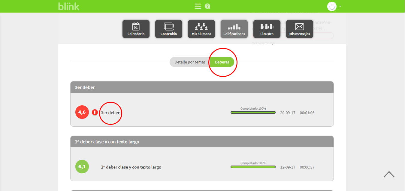 Desde la ficha del alumno también puedes revisar sus deberes y cambiar las notas del mismo modo que en los ejercicios.