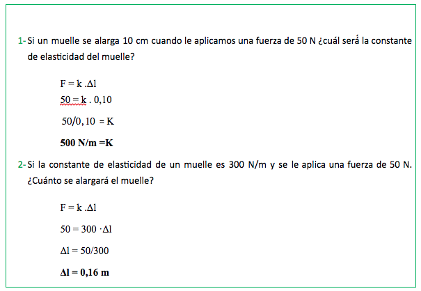Donde F es la fuerza que actúa; k es la constante de elasticidad y Δl es el alargamiento que se produce.