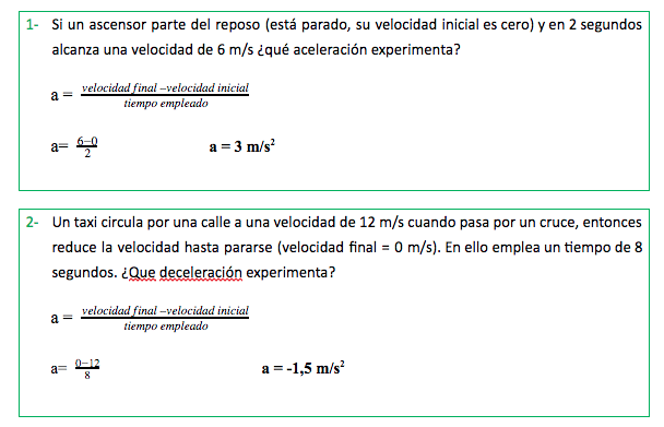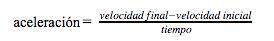 La aceleración se define como la diferencia entre la velocidad final y la velocidad inicial, dividida por el tiempo que tarda en realizar este cambio de velocidad: