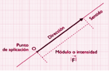 Al inicio de la unidad hemos dicho que las fuerzas son magnitudes vectoriales ya que es necesario conocer su intensidad o módulo (valor numérico en newtons), la dirección (la recta sobre la que se encuentra), el sentido (indica si la fuerza está orientada hacia un lado u otro de la recta) y el punto donde se aplica.