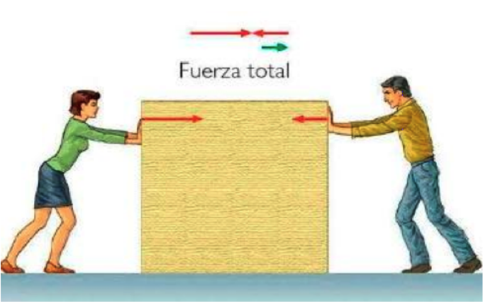 Si ahora la fuerza que realiza la chica es de 15 N y la que realiza el chico es de 10 N, la fuerza total será la diferencia entre ambas, es decir 5 N. La dirección será la mismas que las que tenía las fuerzas originales y el sentido el de la mayor, es decir, el bloque se moverá en el sentido en el que empuja la chica que es la que realiza mayor fuerza.