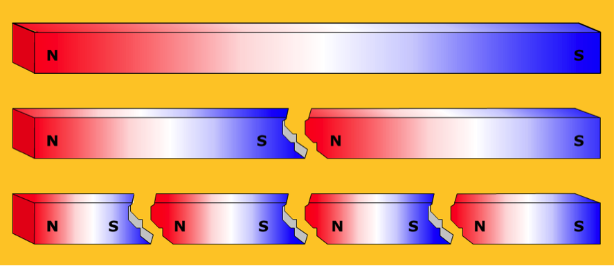 - Si dividimos un imán podemos observar que sigue manteniendo un polo norte y otro sur, no podemos encontrar un imán con un solo polo