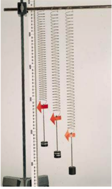 - Si de un muelle se cuelga un peso que realiza una fuerza F, el muelle se alarga una longitud.