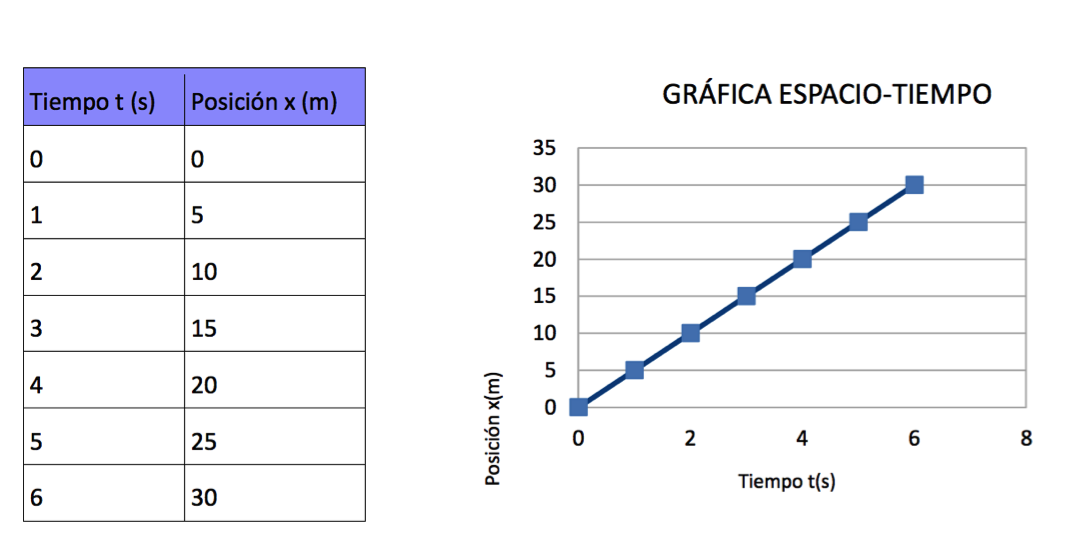 Por ejemplo: Un móvil que se desplaza a 5 m/s, sale desde una posición inicial x0 = 0, en un instante de tiempo t0 = 0 y se mide la posición que ocupa el móvil a diferentes tiempos. Así se representa gráficamente la posición del móvil respecto al tiempo: