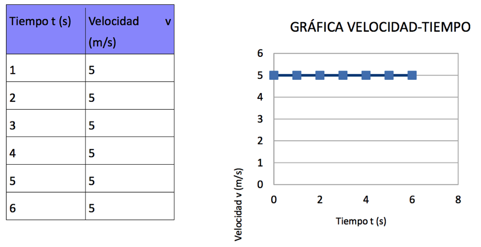 Si ahora se representa la velocidad de ese móvil (5 m/s) en función del tiempo, con los mismos tiempos que en el ejemplo anterior, tendremos: