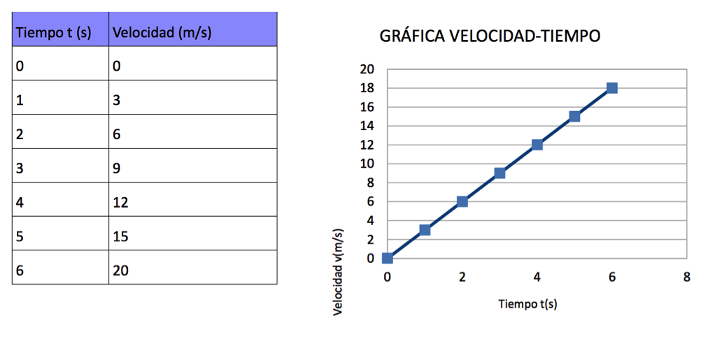Representamos ahora la velocidad en función del tiempo. Recuerda que conoces la aceleración (3 m/s2), la velocidad inicial (v0=0 m/s) y los tiempos.