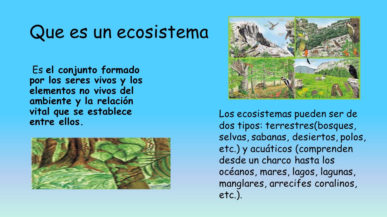 Debes consultar este enlace (desde la diapositiva 9 a 12), e imágenes en la web y construir un documento sobre los distintos ecosistemas terrestres y acuáticos que podemos encontrar . Más tarde se colgará la tarea en la carpeta correspondiente de Classroom, Showbie, etc.