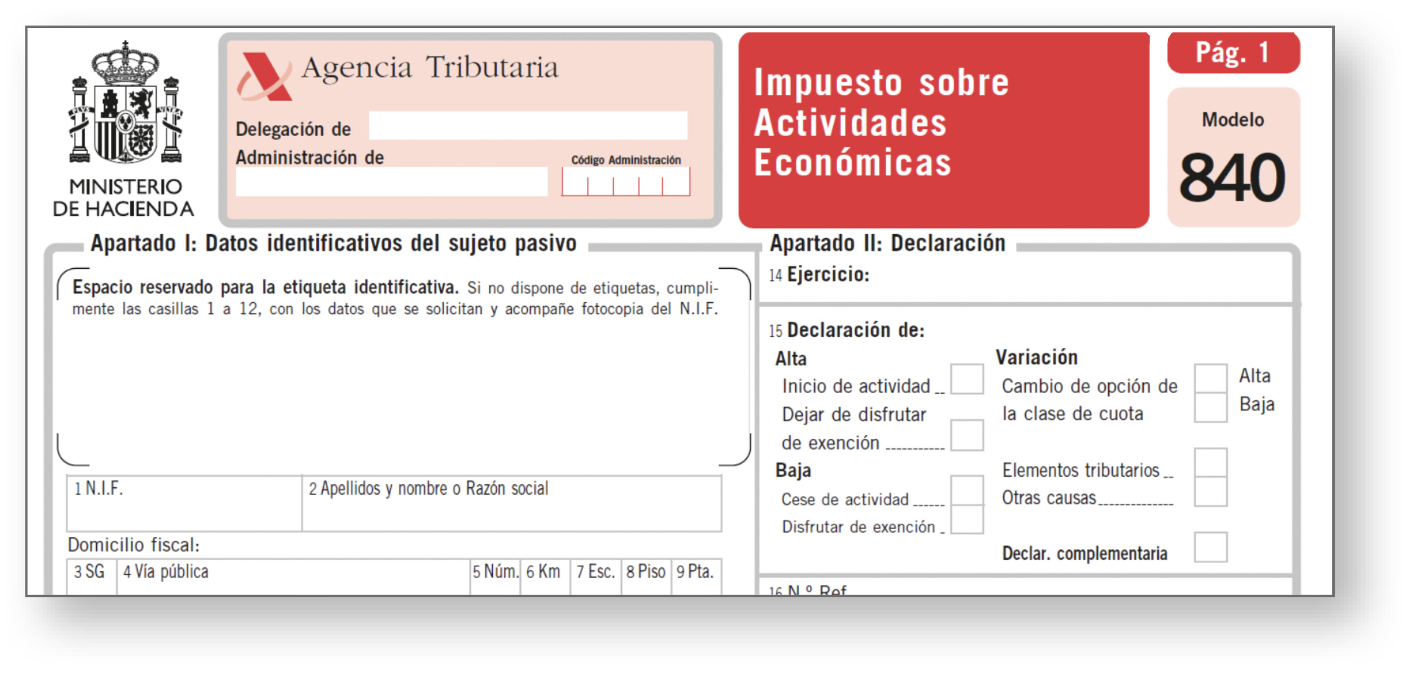 Modelo 840 | Se debe presentar en los siguientes casos las declaraciones del impuesto sobre actividades económicas: • Altas. Por iniciar una actividad. Se presentará en un mes desde el inicio de la misma. • Variaciones. En el plazo de un mes desde la fecha en que se produjo tal circunstancia. • Bajas. Por cesar en el ejercicio de la actividad. Se presenta en el plazo de un mes desde el cese. | |